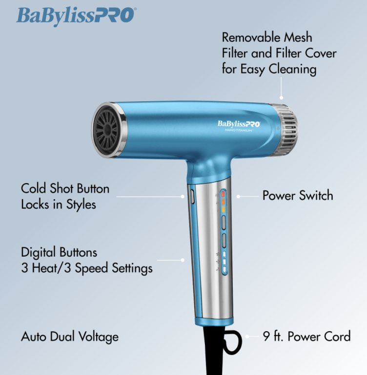 • BaBylissPRO NANO TITANIUM LIGHT DUAL VOLTAGE IONIC HIGH-SPEED DRYER – BNTC9200C