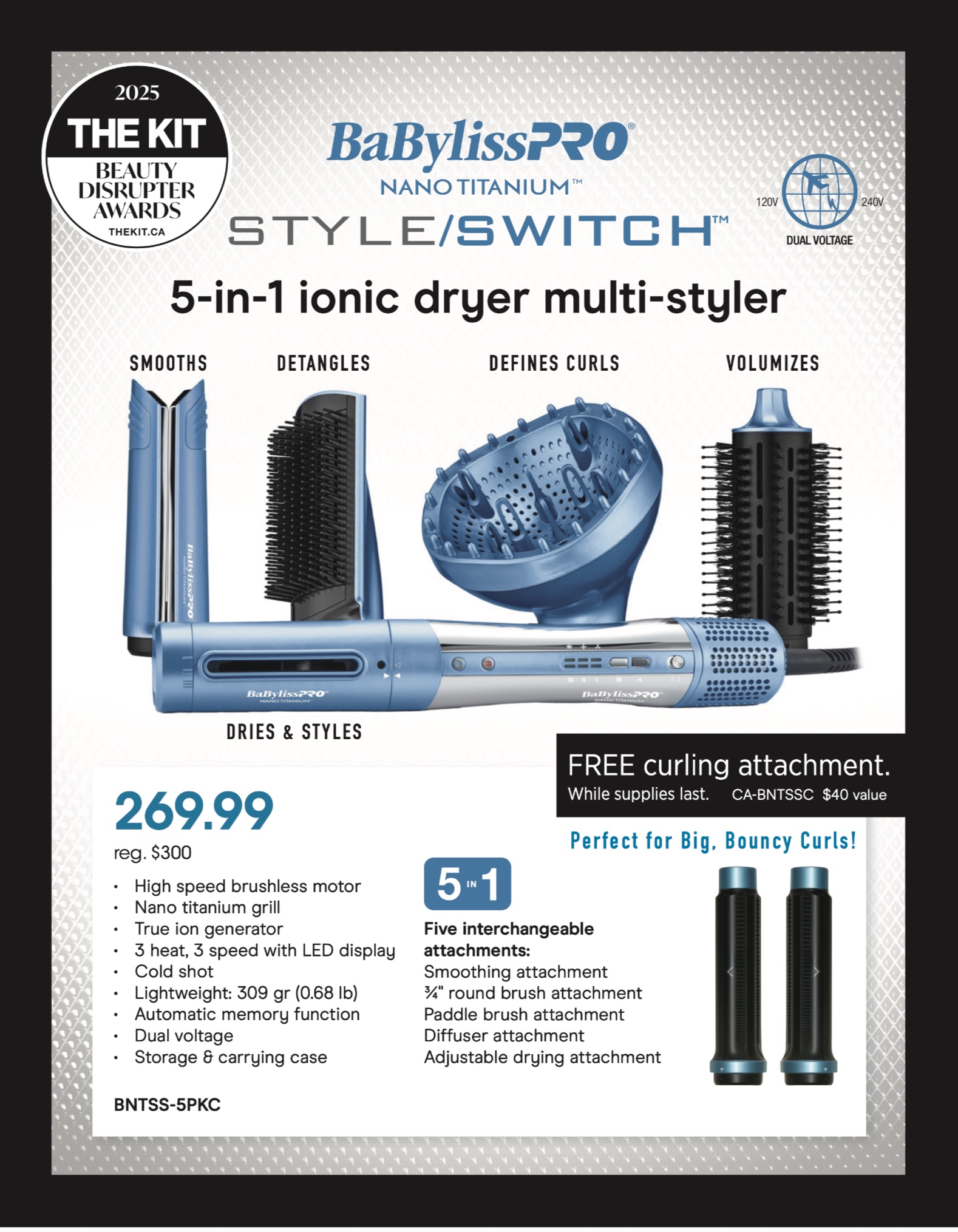 The BaBylissPRO® STYLE/SWITCH™ Ionic Multi-Styler & Dryer is a versatile must-have tool that simplifies the styling routine for all hair types – from fine and straight to thick, curly, and wavy.
