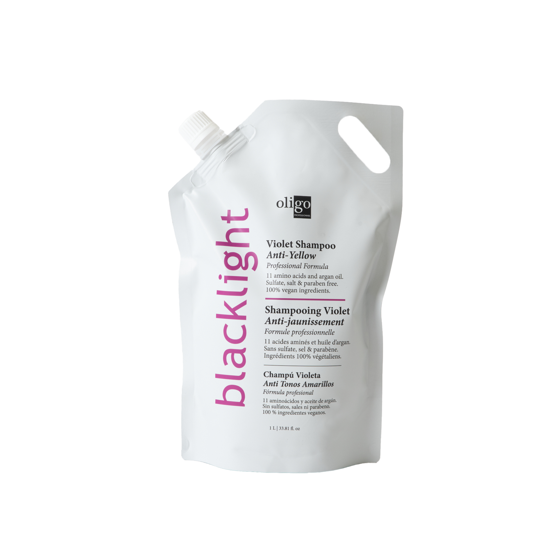 Blacklight Violet Shampoo’s professional formula is stronger than the retail formula for better tonal control. This shampoo, formulated for highlighted, bleached, white and natural blonde hair, eliminates yellow tones, brassiness and refreshes faded highlights leaving hair looking cleaner and brighter. Its unique formula, enriched with 11 amino acids and argan oil, moisturizes, strengthens hair structure and repairs surface damage while increasing shine and colour retention. Sulfate, salt and paraben free.